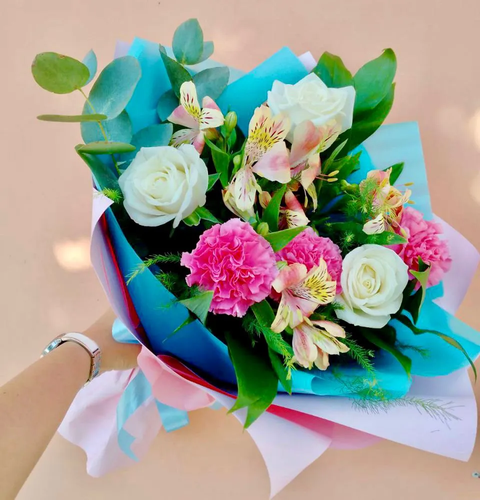 Роза ,гвоздика, альстромерия, эустома, зелень, упаковка, лента |
