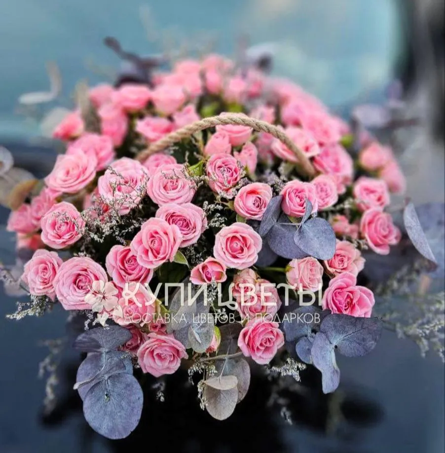 Позвольте представить вам воплощение изящества и свежести – корзина, наполненная чарующими розовыми кустовыми розами и утонченным эвкалиптом. Эта композиция – истинное произведение природы, где каждый элемент гармонично дополняет другой, создавая атмосферу умиротворения и нежности.