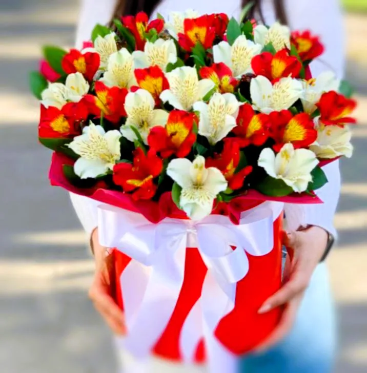 Шляпная коробка с красной и белой альстромерией — это великолепный подарок, который подчеркнёт ваши чувства и настроение