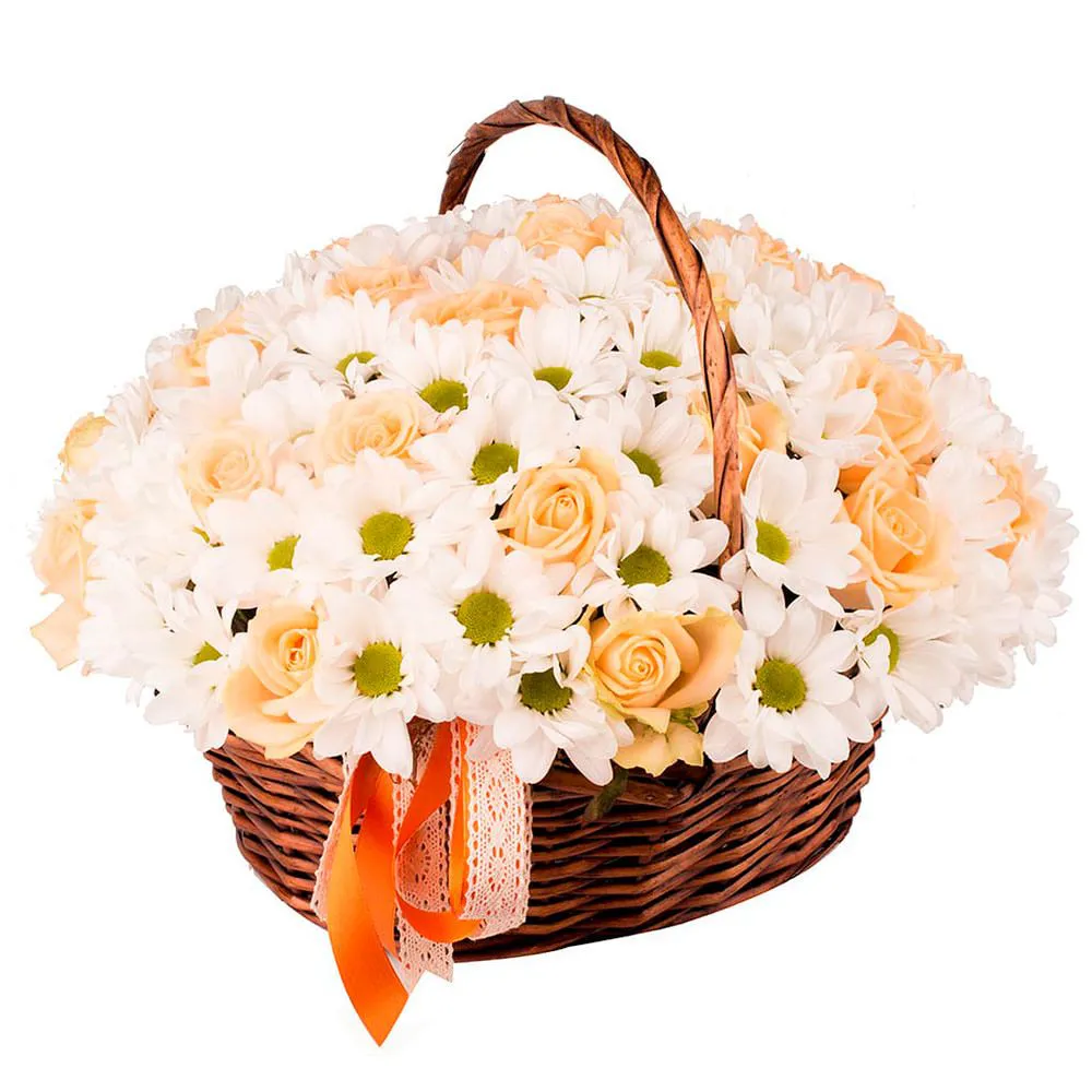 Вариант—Стандарт (хризантема кустовая - 5 шт., роза - 5 шт., оазис, корзина, лента)