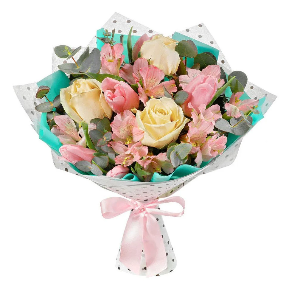 Роза, альстромерия, тюльпан, зелень, упаковка, лента