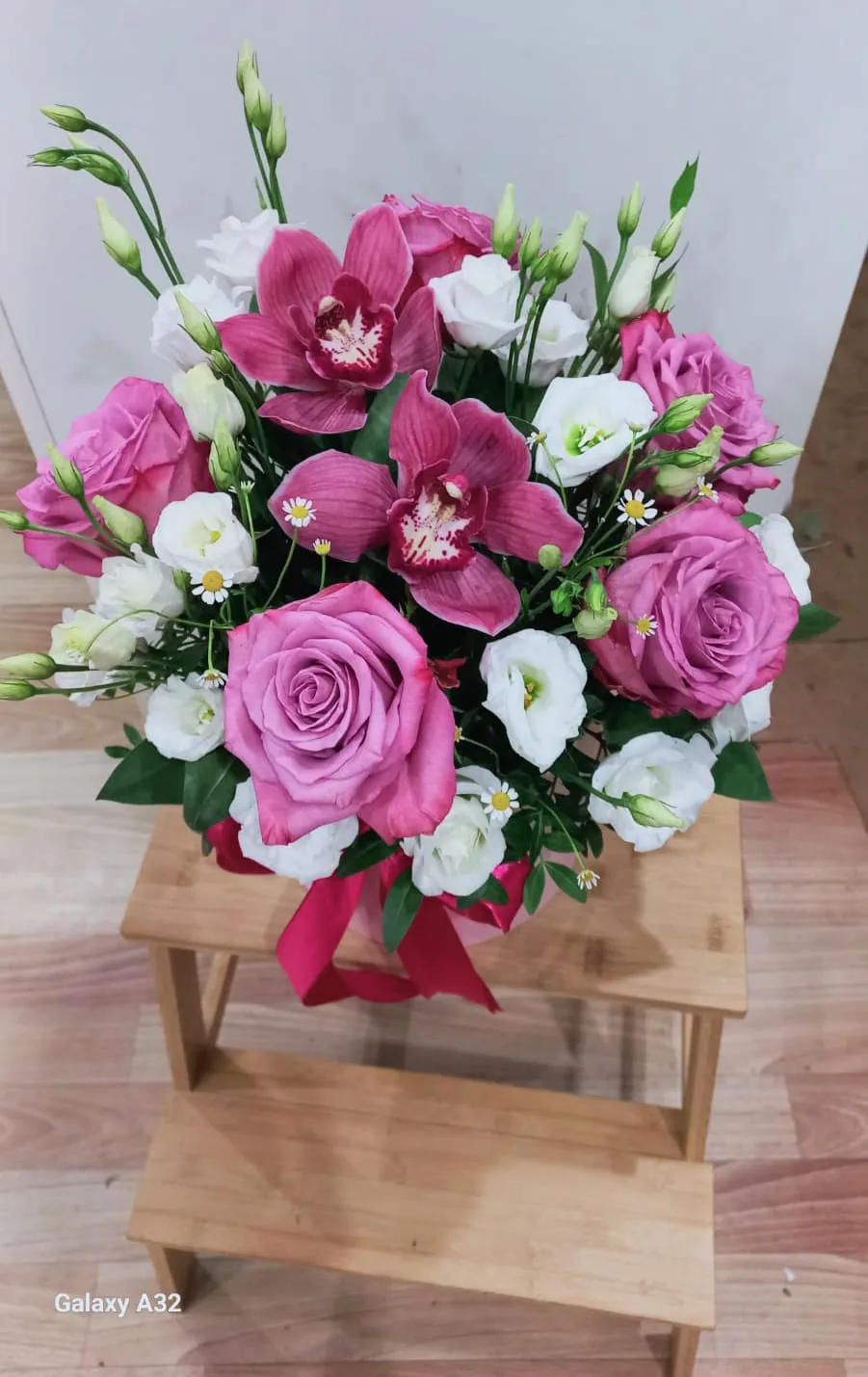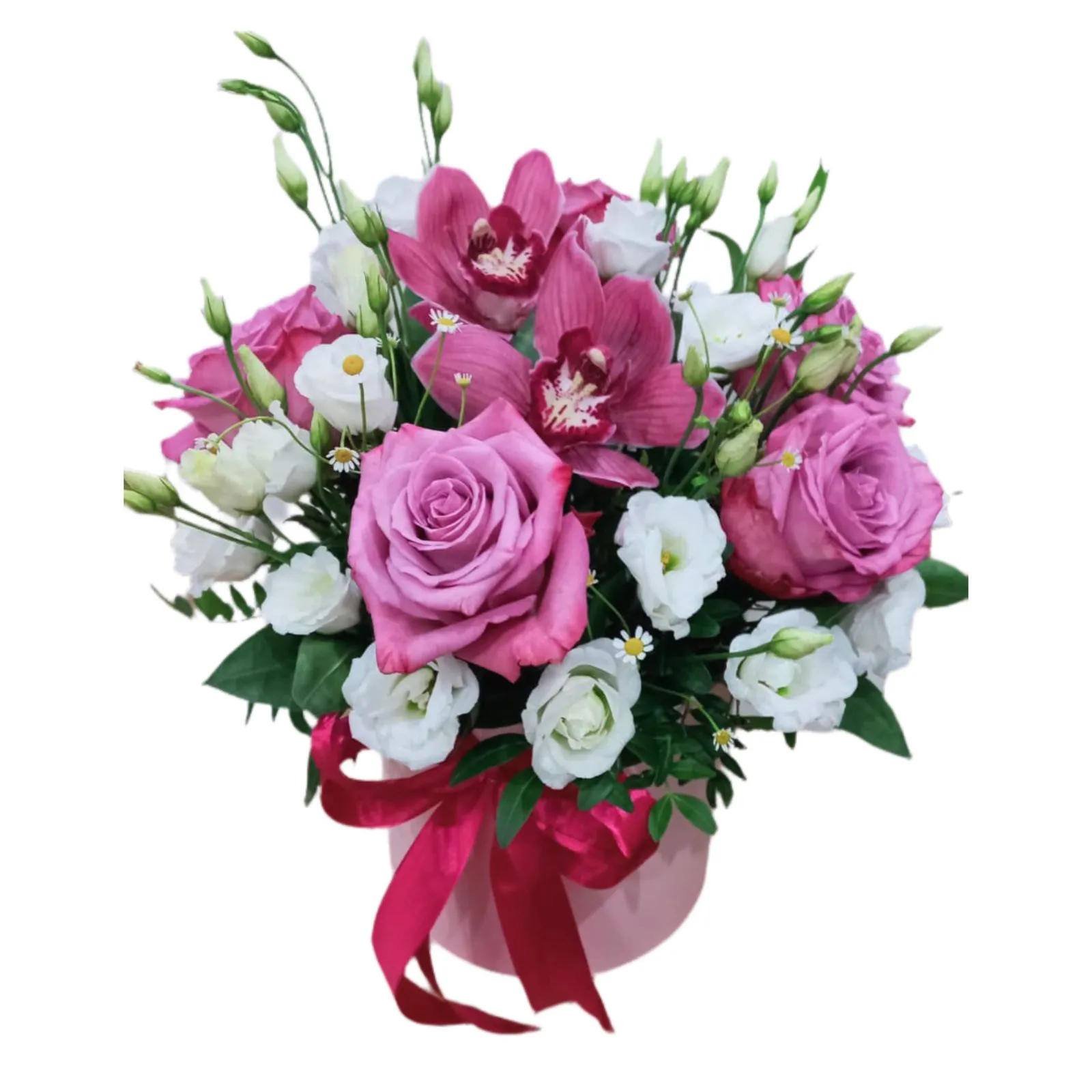 Вариант—Стандарт на фото (роза - 5 шт., орхидея - 2 шт., эустома - 3 шт., оазис, корзина)