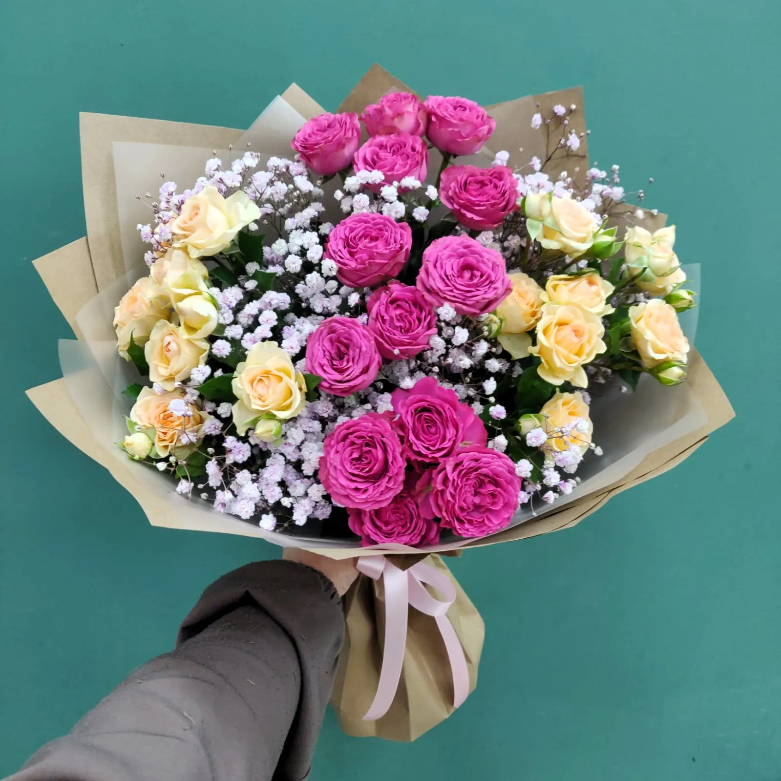 Кустовая роза, гипсофила, упаковка,лента