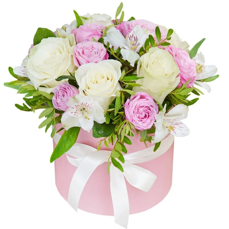 Нежная цветочная композиция в  шляпной коробке смотрится органично, а добавление зелени и альстромерии обеспечивает естественность.