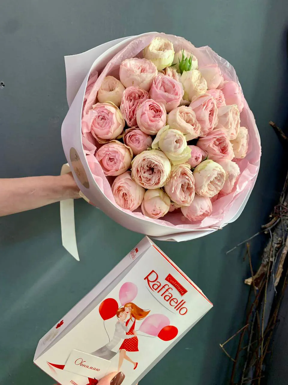 Кустовая пионовидная роза, упаковка, лента