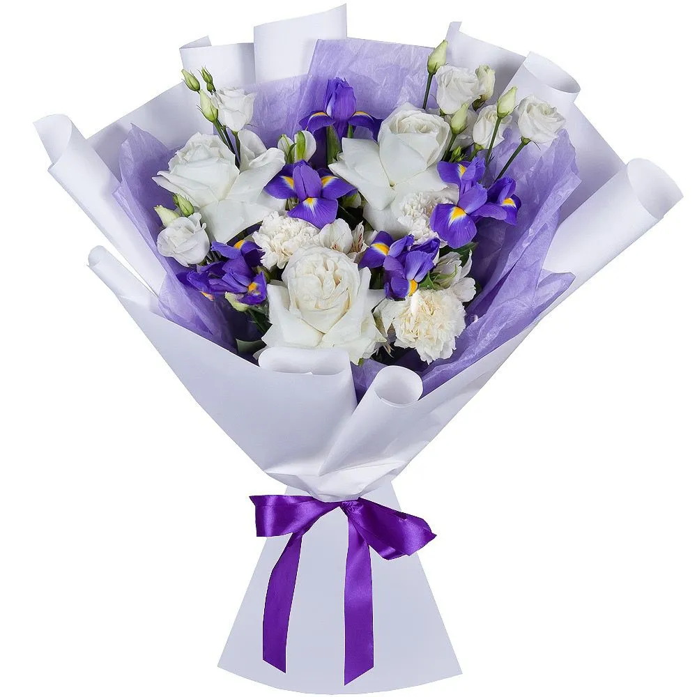 • Стандарт - ирис - 5 шт, роза - 3 шт, эустома - 1 шт, альстромерия - 2 шт, гвоздика - 3 шт, упаковка, лента