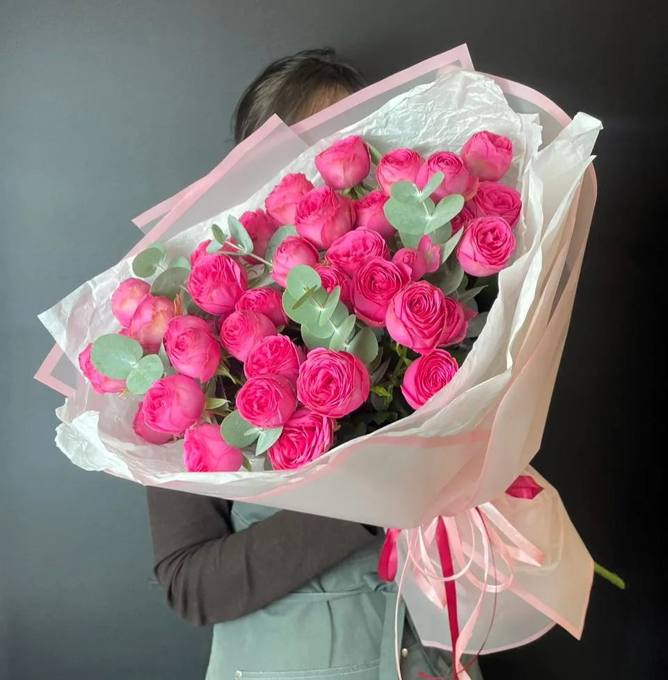 Пионовидные розы, зелень, упаковка, лента