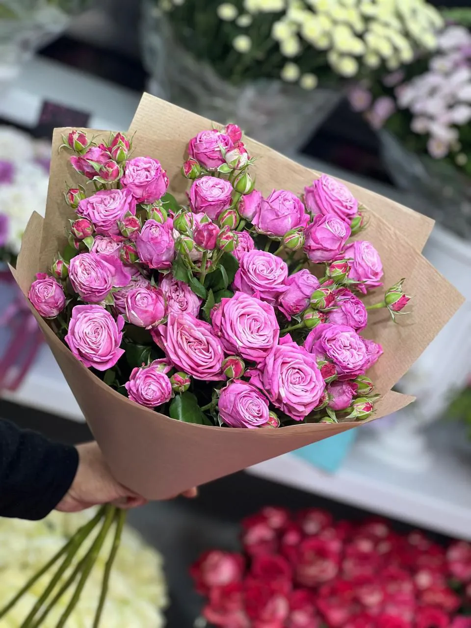 Букет из кустовых пионовидных роз — это настоящий шедевр флористического искусства. Каждая роза в этом букете словно создана для того, чтобы радовать глаз и трогать душу. Цветы обладают нежной текстурой и выразительной формой, что создает эффект легкости и воздушности.