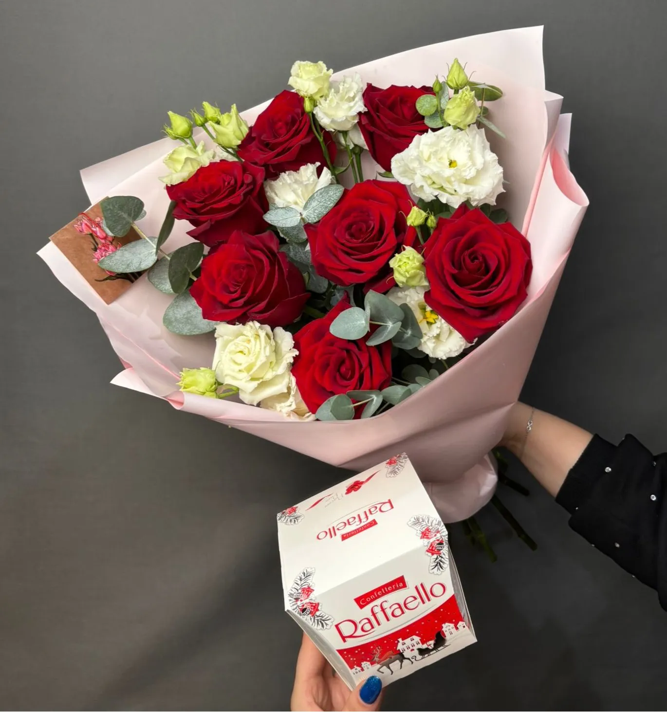 Букет эффектно оформлен в стильной упаковке, которая подчеркивает его красоту и свежесть. В дополнение к этому, композиция убаюкивает глаз шикарной коробкой Рафаэлло, наполненной восхитительными сладостями, что делает этот подарок уникальным и желанным.